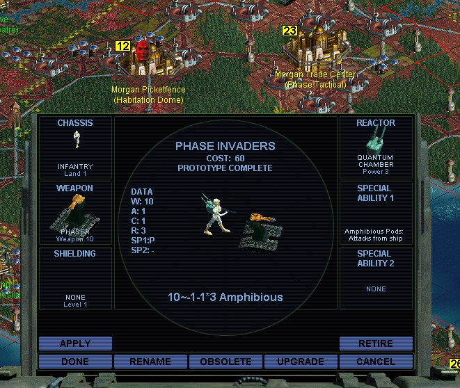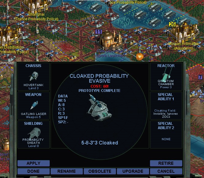 Some of my cities are finishing their Flechette Defense Systems.  It's time to upgrade my defense.  Fiddling with unit designs, I see that for a Quantum unit, a Speeder doesn't cost anything extra over an Infantry chassis.  However in my mod you can't have ECM on a Speeder.  Usually I combine AAA and ECM for defense.  Since I can't do that, and having free wheels seems marginally kewl, I make this a Cloaked unit.  I thought about giving it Air Superiority but I don't know that a strength 1 handgun is going to be that good against enemy planes.