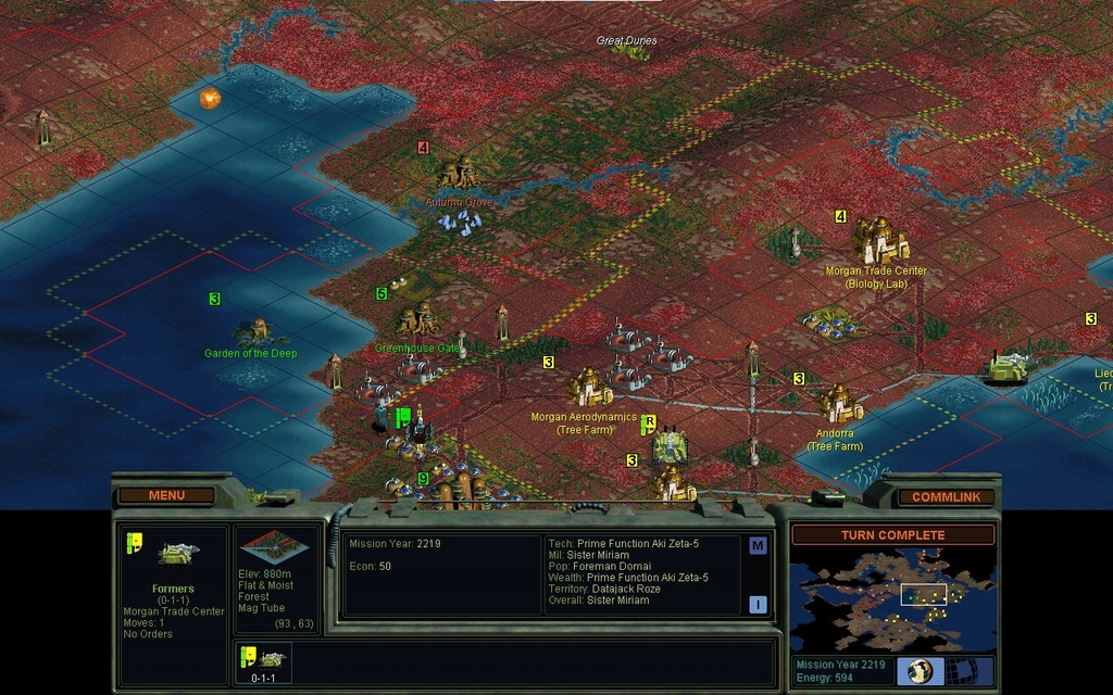 MY 2247.  I have completed a causeway to the western portion of my empire.  I've made Morgan Construction my capitol, to exert greater happiness in the west.  I've got a wall of troops and spore launchers coming, but they haven't been as fast as my Clean Formers in this theater.  That's saying something because raising land takes twice as long in my mod.  The land remains under my ownership, so I don't need to take over Data DeCentral.  I've stolen Doctrine: Air Power from the Data Angels, so I offer a Truce.  However they're ignoring my transmissions.