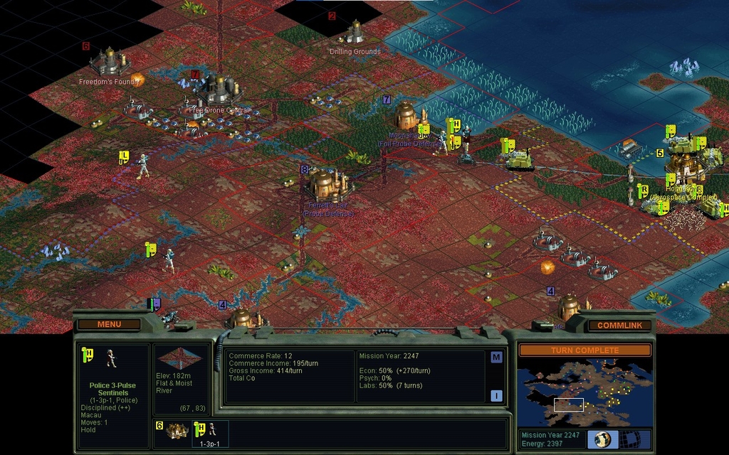 MY 2215.  I'm making a lot of money.  I complete all of my Network Nodes.  My conventional units are wimps, so I do the "mindworm Wealth" thing.  The Believers came to pester my northeastmost city with a single Rover.  Fortunately my Synthmetal Garrison barely held up.