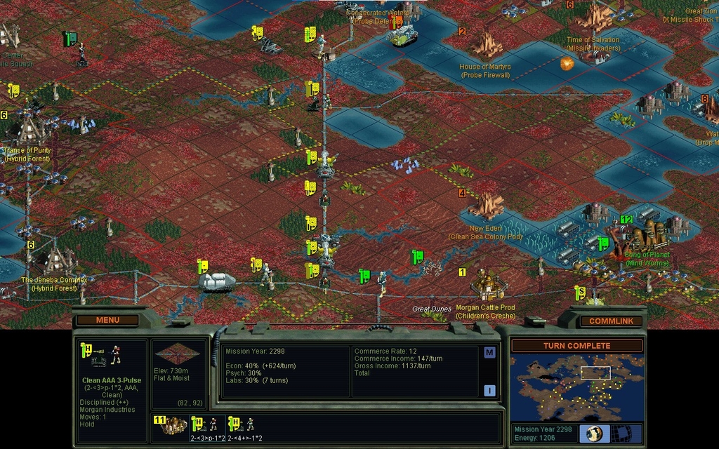 My JUSTICE rating is higher than I thought, but I can't have any budget I want without penalty.  Switching to 30-40-30 does not trigger any pop booming.  I may need to get to +4 JUSTICE and budget much more drastic happiness.  Picking either Socialist or Knowledge seems to lose me 100 credits / year.  Socialist might Domai up, and will frost Deirdre.  It also reduces my mindworm oomph, so it's not ideal.  You might notice that I'm allowed to pick it, unlike the stock game where a Planned economy is forbidden to Morgan.  This is because it isn't that great a choice.  It's not any crazier than Morgan going Green, so why not allow it?  Anyways I'm not there yet.  I consider Knowledge but it'll put my POLICE rating at -5.  I have very few units in enemy territory right now, but I might as well pull them all back before bothering with this.  Status quo maintained for now.  I need money to complete my Secret Projects, and I haven't built Hab Domes yet anyways.