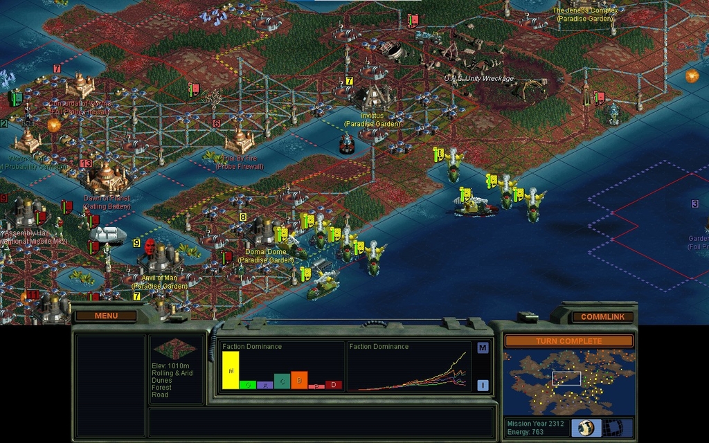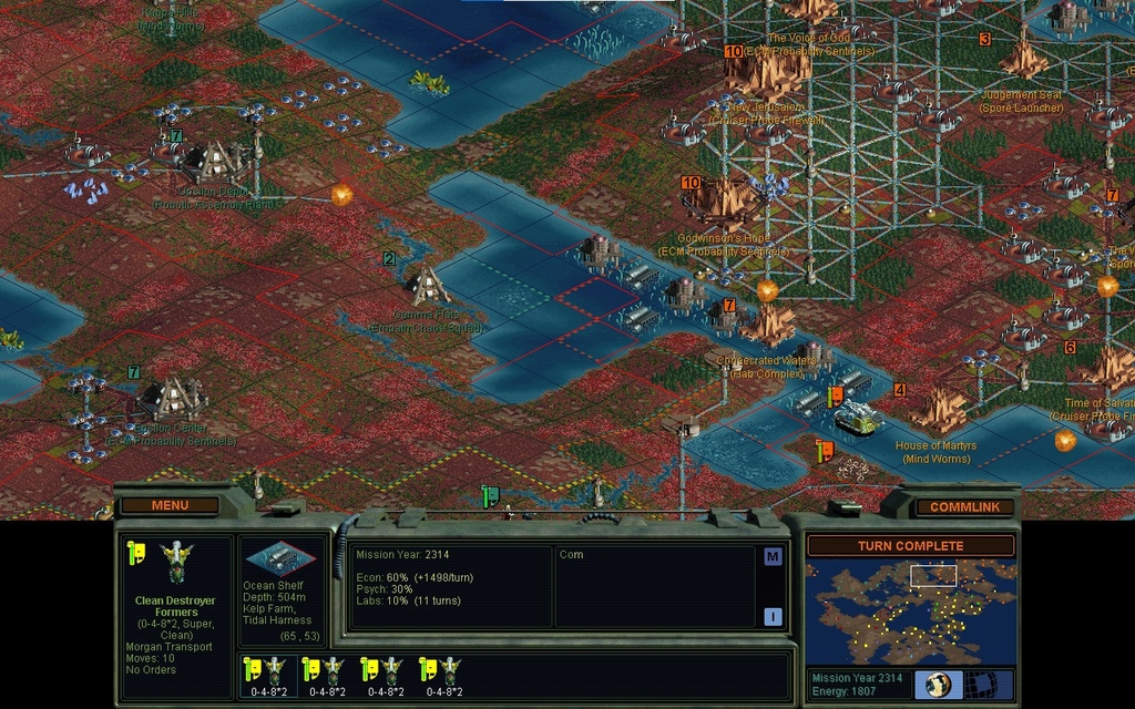 I want to dig a canal to The Jeneba Complex so that I can improve the sea squares of the 2 bases up there.  I start using excess land Formers to lower the land south of it, while my Sea Formers dig the canal.  I tried to dig at the Energy special, but bizarrely, the game told me that would mess up Gaian territory.  That doesn't make any sense as they don't own that water, it's international.  Nor do they own the coastal land, it's mine.  Well whatever.  That entire coast, gave me the same error message.  So I had to dig on the other side of the peninsula, and part of the Unity wreckage was a casualty that.  Guess any school field trips are gonna need scuba gear!