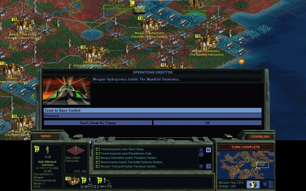 MY 2314.  Last year I decided to finish the Manifold Harmonics first.  Fungus is now valuable!  Pity I spent the whole game preparing to go Capitalist by stripping fungus away from my cities.  I didn't really expect to reach the Manifold Harmonics in a timeframe where it would be useful.  Now I see that I didn't have much long term vision in that regard.  Golden Ages don't work either, people have too many drones for it.  I'm only going to get pop booming by finishing the Cloning Vats.