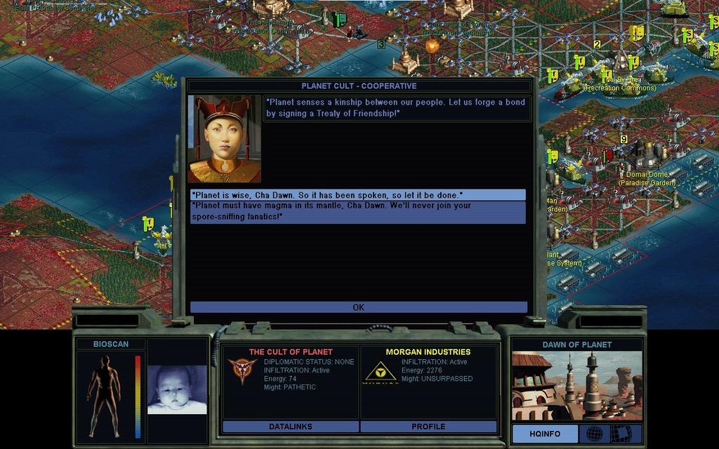 This shall be the One True Unit from now on.  I'm really tired of other factions milling around my land.  Maybe I'll finally start making some Treaty threats, now that I don't have a real enemy to go conquer.  Like how long until Domai caves in?  I make the diplomatic rounds and actually talk to him.  I get him to knock it off with Deirdre.  I tell Deirdre to knock it off with the Cult of Planet.  Cha Dawn says others have to cease and desist, and he foolishly ignores my generous offer of an alliance.
