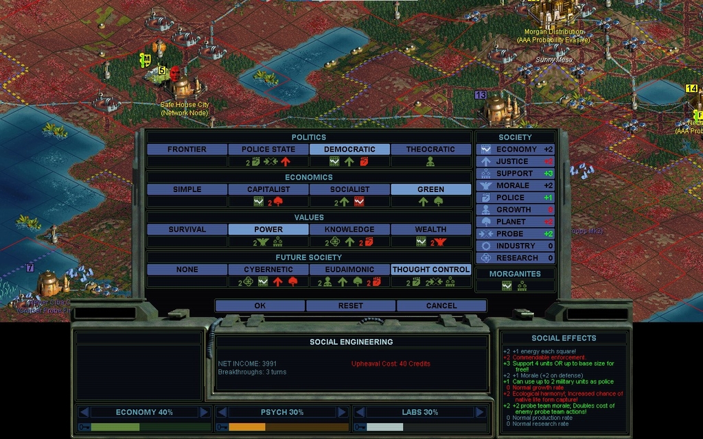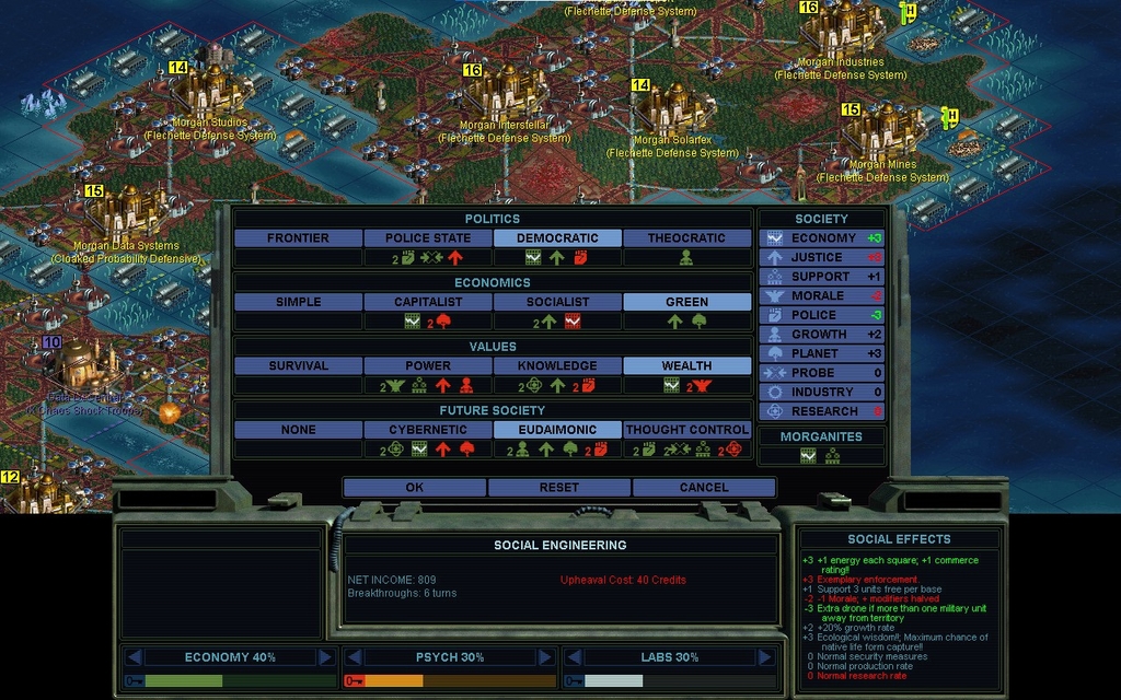 I don't need GROWTH, nor do I need my PLANET rating stellar high for combat.  Thought Control has no downsides anymore, and it's definitely in-character for Morgan, if he's not money grubbing too hard.  Hm, why does my income say 3991 credits/turn ?  That seems improbably high compared to previous norms.  Have the Cloning Vats been responsible for that much increase in wealth so quickly?  At that kind of rate, even Economic Victory is a possibility.  Although, the current price on that with my choices is 112k credits.  That's 28 turns assuming no change, and I think I'll have Diplomatic Victory a lot sooner than that.  Upon further investigation, we're having a solar flare and it won't last.