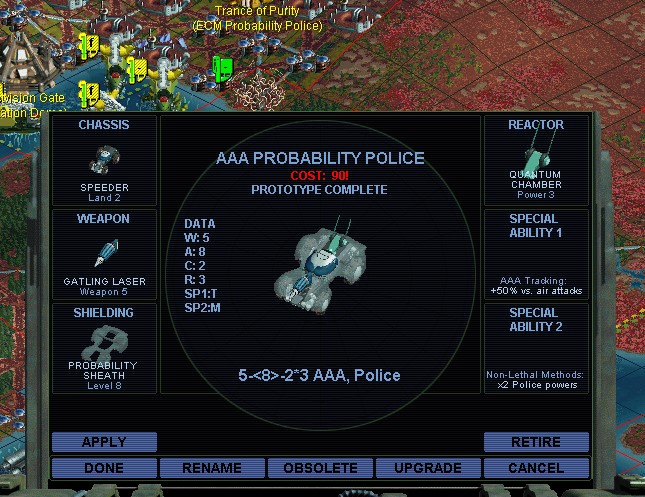 Some of my cities are finishing their Flechette Defense Systems.  It's time to upgrade my defense.  Fiddling with unit designs, I see that for a Quantum unit, a Speeder doesn't cost anything extra over an Infantry chassis.  However in my mod you can't have ECM on a Speeder.  Usually I combine AAA and ECM for defense.  Since I can't do that, and having free wheels seems marginally kewl, I make this a Cloaked unit.  I thought about giving it Air Superiority but I don't know that a strength 1 handgun is going to be that good against enemy planes.