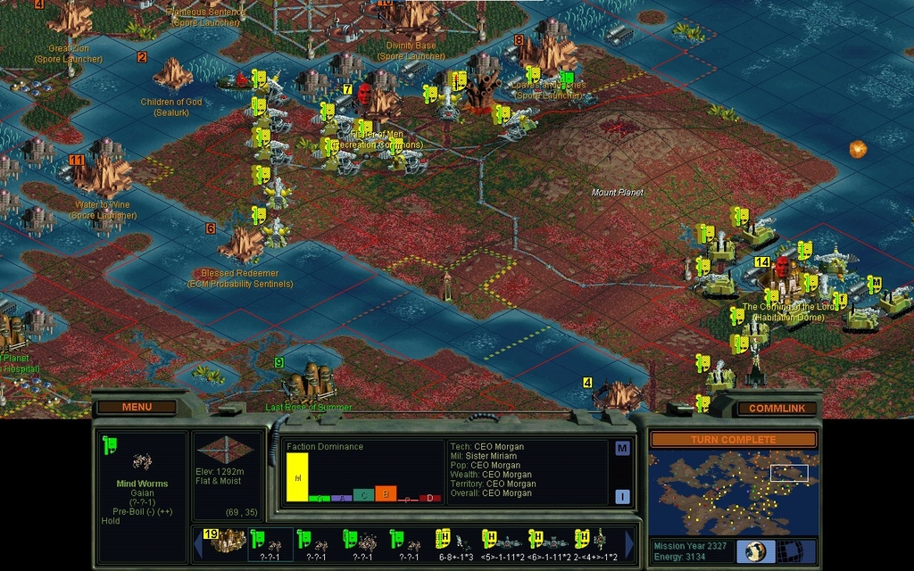 MY 2323.  The Believer air force has been rather quiet as of late.  I think if there's anything left, it's busy with the Cyborgs.  I've completed all my terraforming elsewhere, so now I'm attaching these far flung conquests to my empire.  I'm going to take over the land by raising the sea bases onto it.