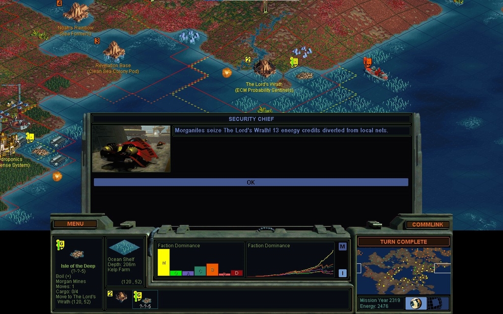 MY 2318.  Boy the Believers really have it in for the Cyborgs!  I presume this was a probe team action.  Wonder if they'll hold it?  In my mod the Believers are immune to mind control, so the Cyborgs won't be mind controlling it back.  I find that over time, the Believers do tend to hold their ground and advance, because they can't be subverted.