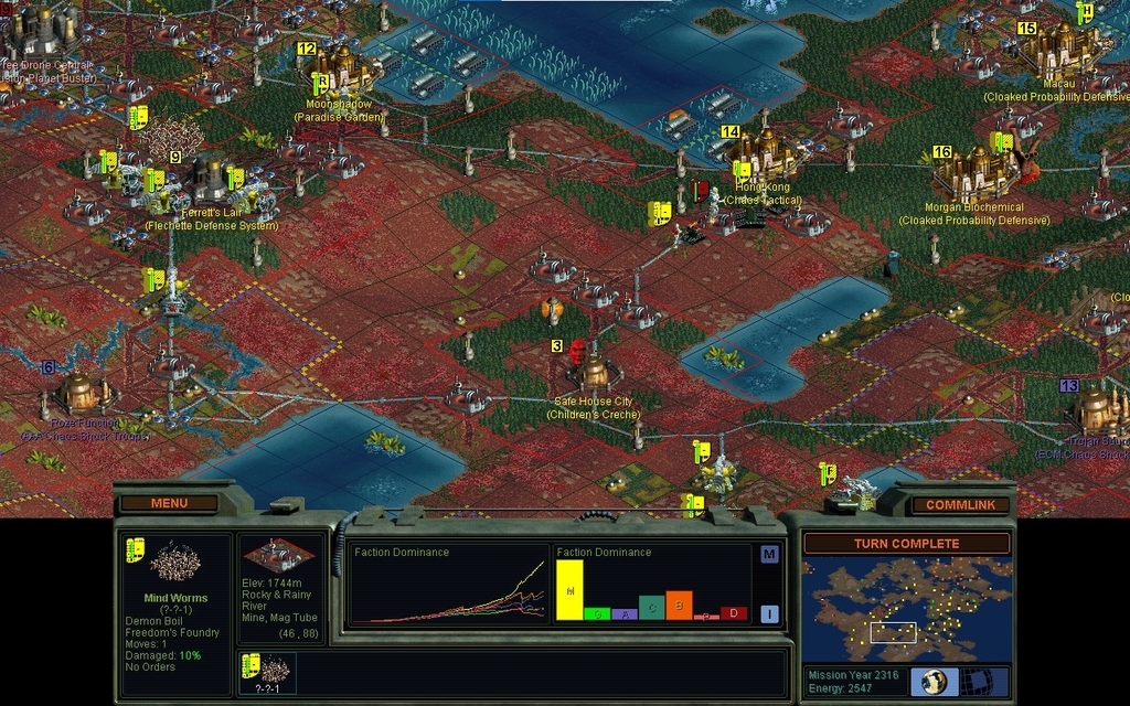 I kill all of Domai's units in the field, to deter him from surprise attacking me once we've got a Truce again.  Also because many of my ancient units aren't strong enough to penetrate a base with Probability defenders, but they can kill the stuff Domai's had milling around in the open.  Mindworms are needed to take out a base, and I've never built new ones.  I actually take a couple of losses, but Craftsman Keep falls readily enough.  Domai accepts his weakness, and I get him to make peace with the Data Angels as well.