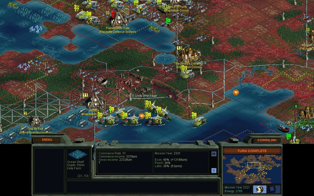 I want to dig a canal to The Jeneba Complex so that I can improve the sea squares of the 2 bases up there.  I start using excess land Formers to lower the land south of it, while my Sea Formers dig the canal.  I tried to dig at the Energy special, but bizarrely, the game told me that would mess up Gaian territory.  That doesn't make any sense as they don't own that water, it's international.  Nor do they own the coastal land, it's mine.  Well whatever.  That entire coast, gave me the same error message.  So I had to dig on the other side of the peninsula, and part of the Unity wreckage was a casualty that.  Guess any school field trips are gonna need scuba gear!