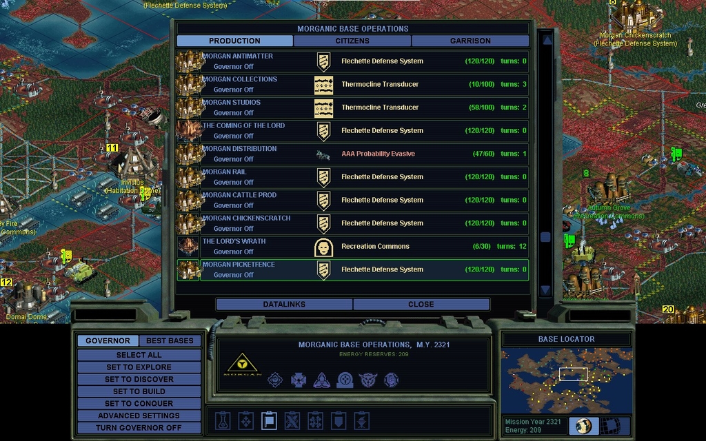 I don't need GROWTH, nor do I need my PLANET rating stellar high for combat.  Thought Control has no downsides anymore, and it's definitely in-character for Morgan, if he's not money grubbing too hard.  Hm, why does my income say 3991 credits/turn ?  That seems improbably high compared to previous norms.  Have the Cloning Vats been responsible for that much increase in wealth so quickly?  At that kind of rate, even Economic Victory is a possibility.  Although, the current price on that with my choices is 112k credits.  That's 28 turns assuming no change, and I think I'll have Diplomatic Victory a lot sooner than that.  Upon further investigation, we're having a solar flare and it won't last.