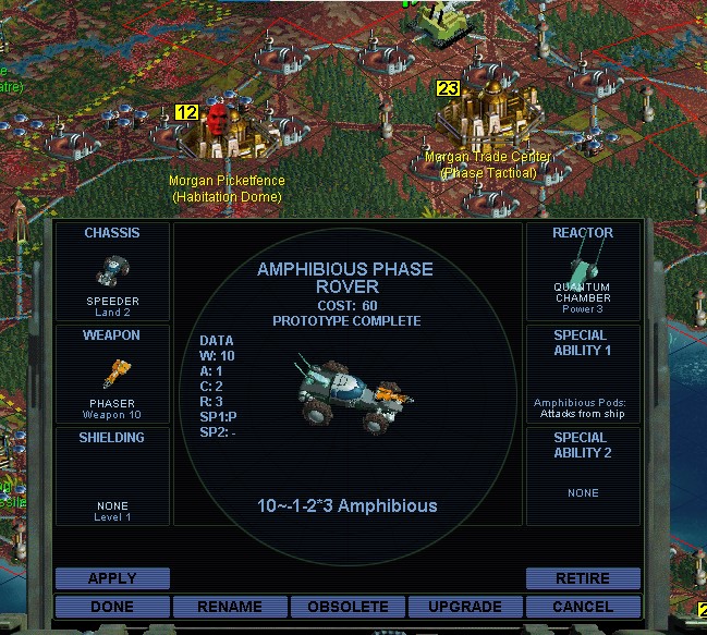 Some of my cities are finishing their Flechette Defense Systems.  It's time to upgrade my defense.  Fiddling with unit designs, I see that for a Quantum unit, a Speeder doesn't cost anything extra over an Infantry chassis.  However in my mod you can't have ECM on a Speeder.  Usually I combine AAA and ECM for defense.  Since I can't do that, and having free wheels seems marginally kewl, I make this a Cloaked unit.  I thought about giving it Air Superiority but I don't know that a strength 1 handgun is going to be that good against enemy planes.