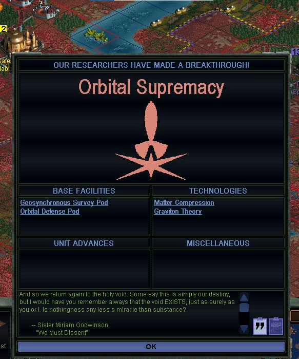 I mean, if I really wanted this game over, it should be over.  There are all kinds of ways I could win now.  I will keep up the vacuolizing stuff, but let's face it, Miriam's Planet Buster capability is a nominal threat.  I think if I were going to play this style of game over again, I'd focus less on the happiness of my own citizens.  That just causes them to grow, which tends to become its own end.  Leading to Diplomatic Victory, because let's face it, I've got massive votes.  Why should I keep playing when I've actually won?  Whatever excuse is devised for that, it resembles sandboxing.  And more to the point, why should I keep playing when I've been at this since August 20th?  That was 2 weeks ago.
