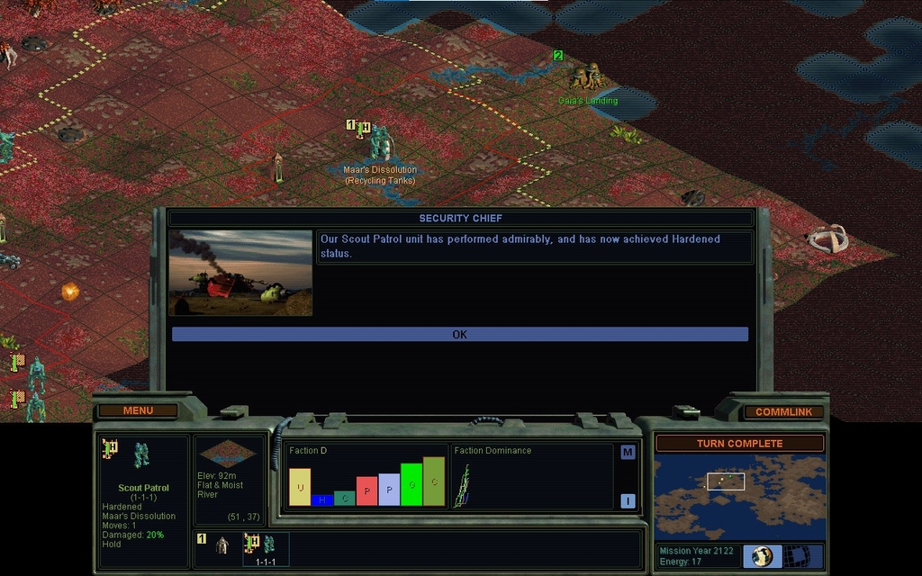Mission Year 2113.  I am close combat, breathing-down-their-neck, even slaughter them with Scouts range of the Gaians.  And I have a Battle Ogre Mk I that I might be able to destroy them with right now.  That said, they're nerfed in my mod.  R-Lasers only have strength 3 and are only good for a few shots, even against mere Scouts.  Gaians aren't pacifists in my mod either, they fight as well as any ordinary faction.  Of course I've got +1 MORALE so I can totally cream them if I want to.  Do I want to?