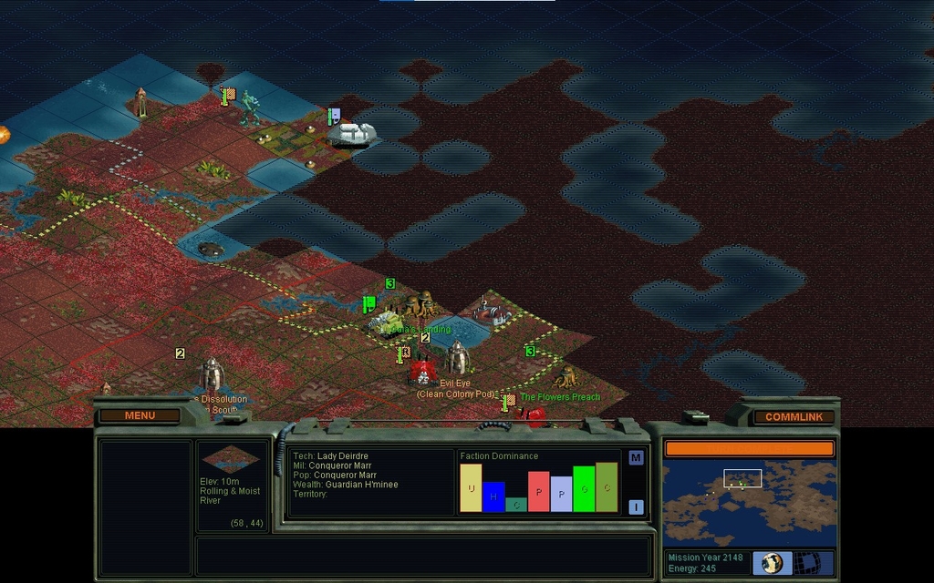 I wasn't expecting all these larvae everywhere, like north of Marr's Dissolution.  I bet it was stirred up by Deirdre.  Putting a base next to a patch of fungus is generally not a good plan, but neither is wandering around a lot when you're on a big land mass.  You're going to have neighbors, and they stand an excellent chance of being hostile.  As far as neighborliness goes, I had no idea how right I was.  Now a larva this early shouldn't be a cause for alarm, as I am in a base and my unit is Disciplined rather than Green.  But if it did kill by base, I'd be pissed.  To be honest I'd save scum that.
