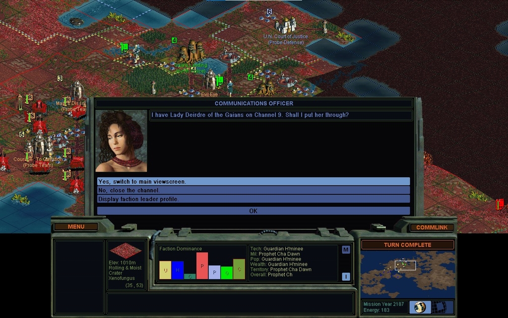 MY 2188.  Honored guest.  Deirdre has figured out how to speak Progenitor.  Surely she will have the most wonderful propositions for us!  Hmm, she's signed a Treaty with Lal.  That's not what I wanted to hear.  She must have gotten E3 Progenitor Psych from the Planetary Datalinks she built.  Only 1 other faction would have had to research it.  Maybe she figured it out herself.  Maybe the Caretakers learned E1 Social Psych, talked to some humans, and traded it to them. Yeah, that's probably how it went down.