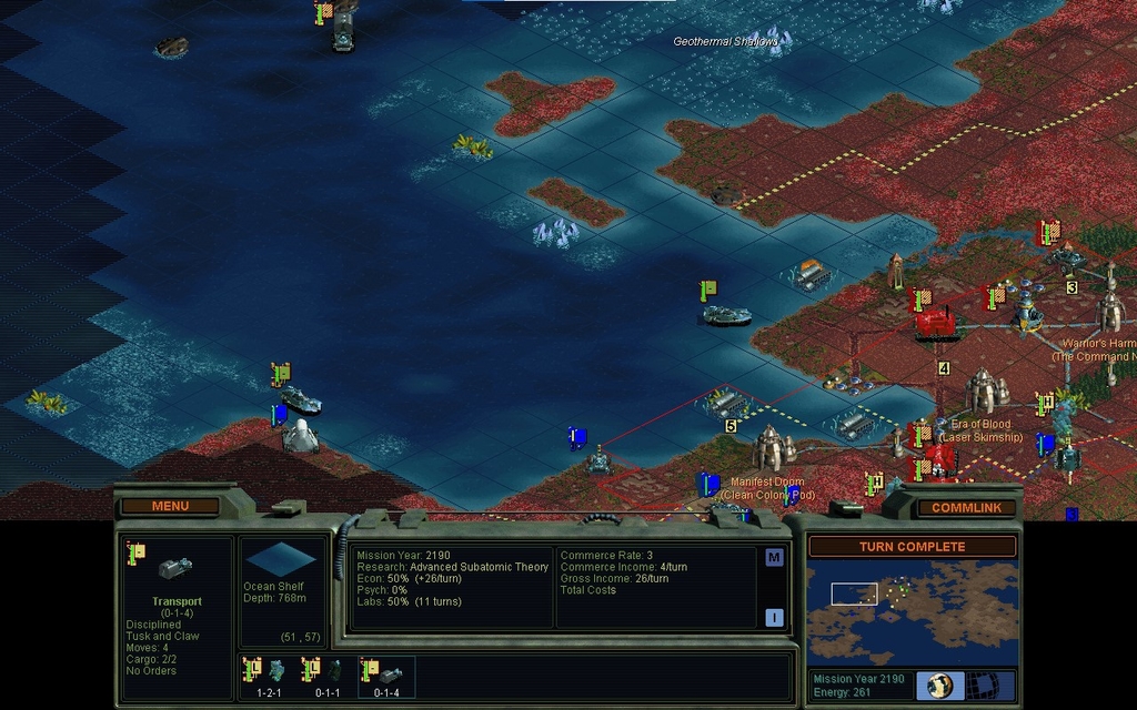 MY 2190.  I was trying to sneak my Transport carrying an Artifact around a Caretaker ship.  But a 2nd ship suddenly appeared and sank it.  That's annoying.  I need a navy.  I've not had much coastal presence, but I do have 2 Colonists in the works.  They are no longer happy in their size 5 cities.
