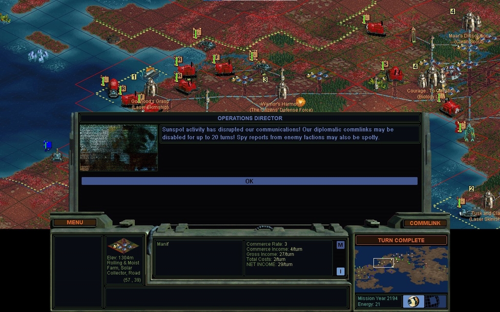 MY 2187.  Yang finally makes his play with the Ogre.  He dies.  Many Recon Rovers are coming up, but they will die too.  The AI is not very bright this way.  It's unfortunate that much of the game, consists of finding these "kill zones", where in practice the AI will squander lots of its units.  That's how you achieve "combat profit" and clean up.  Someday I swear I'll write a game with better tactical AI, so that I don't feel like I'm playing against such a dummy.  It's not the worst game AI I've seen by any means, but it definitely could be better.