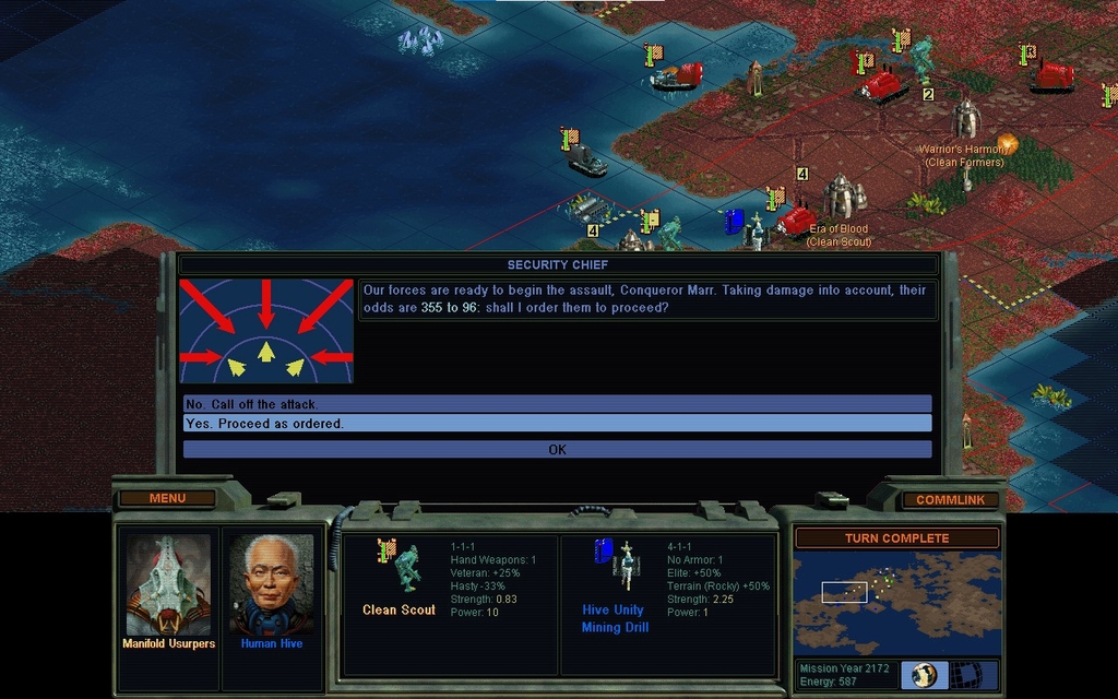 MY 2172.  I've lost like 4 Scouts to this nearly dead, certifiably unkillable Unity Mining Drill.  It's sitting on top of my Sensor Array, about to destroy it.  I need that next year when his Battle Ogre comes for my base, so this thing must be gone.  Quite annoying that my Recon Rover is up north merely holding my citizenry in abeyance.  Even more annoying that Yang is at war with me at all.  This is stupid, all 3 of us in the region are Police States and likely to stay that way.  The real enemy is Lal.