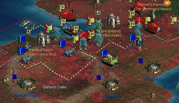 MY 2187.  Yang finally makes his play with the Ogre.  He dies.  Many Recon Rovers are coming up, but they will die too.  The AI is not very bright this way.  It's unfortunate that much of the game, consists of finding these "kill zones", where in practice the AI will squander lots of its units.  That's how you achieve "combat profit" and clean up.  Someday I swear I'll write a game with better tactical AI, so that I don't feel like I'm playing against such a dummy.  It's not the worst game AI I've seen by any means, but it definitely could be better.