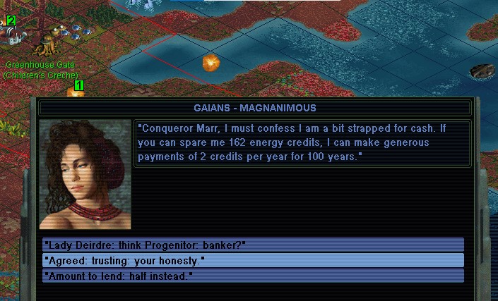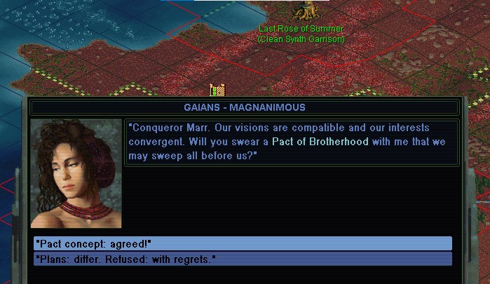 MY 2188.  Honored guest.  Deirdre has figured out how to speak Progenitor.  Surely she will have the most wonderful propositions for us!  Hmm, she's signed a Treaty with Lal.  That's not what I wanted to hear.  She must have gotten E3 Progenitor Psych from the Planetary Datalinks she built.  Only 1 other faction would have had to research it.  Maybe she figured it out herself.  Maybe the Caretakers learned E1 Social Psych, talked to some humans, and traded it to them. Yeah, that's probably how it went down.