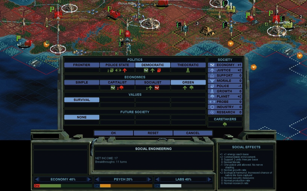 This tech enables Wealth.  I badly need money, do not want to harm my PLANET rating, and am not in conventional military conflict with anyone.  The choice is obvious.  Wealth quadruples my income, which isn't so totally impressive as it was pretty low.  But it's better to inch towards completing these Secret Projects.  The only downside of Wealth is it'll tick off the University.  But a war with them, is merely an opportunity to bridge to their home continent.  Right now they've got sea bases in the way.