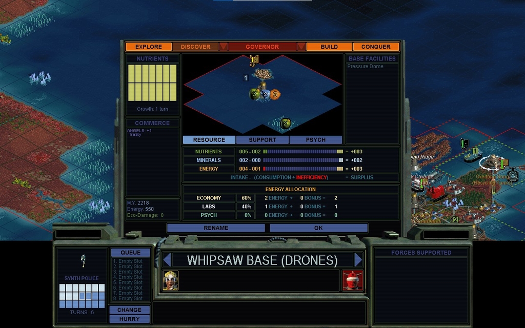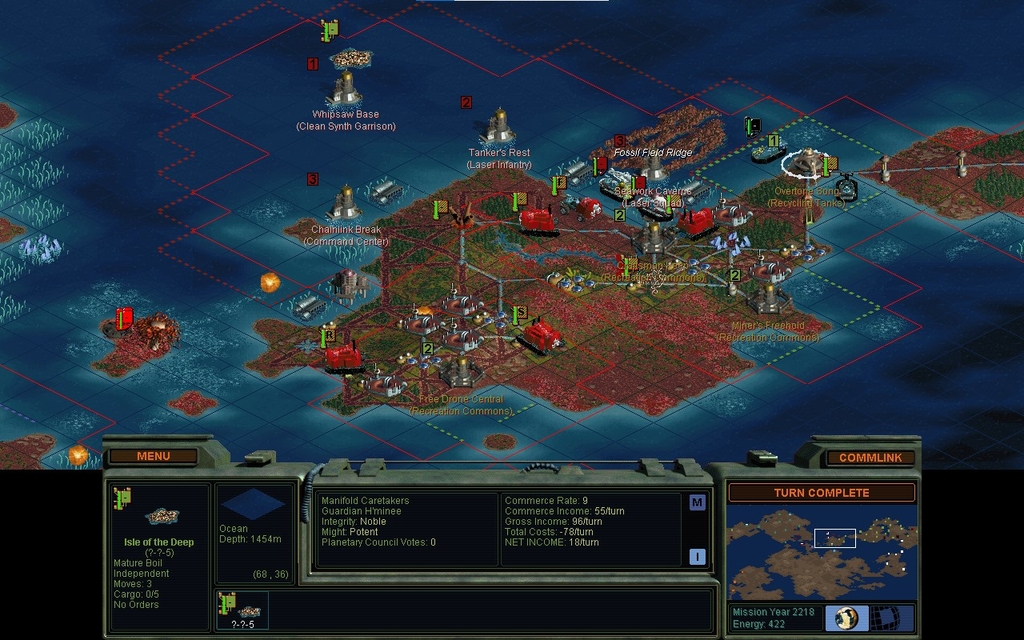 MY 2218.  I establish my permanent seat of rule.  It doesn't magically make people any happier though.  I had drone riots in several cities this year, and decided it's time to up my budget and pay for some happiness.  This has quelled most of the rioters, although I still have a few Colonists in production at various unhappy places.  Right now I seem to be able to sustain cities of size 5.  I definitely need to complete the Human Genome Project.  I would very much like to have the Virtual World.  And the Manifold Nexus.  But first I must put a land bridge around Domai.