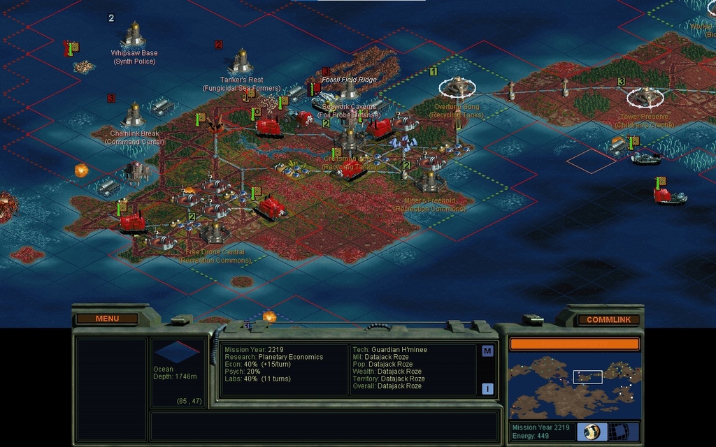 This year I have completed an encasement of my borders with infantry probe teams, so nobody's just going to sail up to anything.  I start making some Rover Probe Teams to go after the Data Angels.  I haven't seen any naval presence or air force, so I think I can sail up with an Isle to deploy.