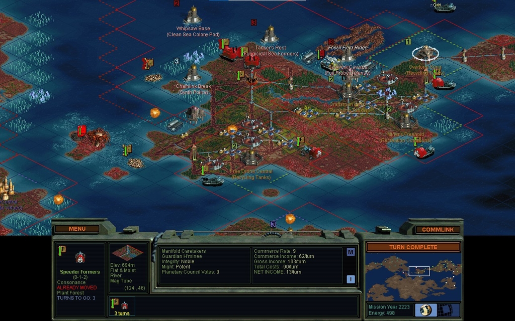 MY 2225.  I'm not sure where Domai got the ships from, but he's killed 2 of my Isles.  He lost 1 ship in the process and badly wounded a 2nd.  I try to move up my almost healed Isle to retaliate, but I forget that it only has 4 movement when wounded.  I reload from an autosaved game, and instead just move 3 squares forward onto the fungus with the energy special.  It's not a big deal because the Isles did complete their mission, but it's annoying that I'll have to go capture them again.