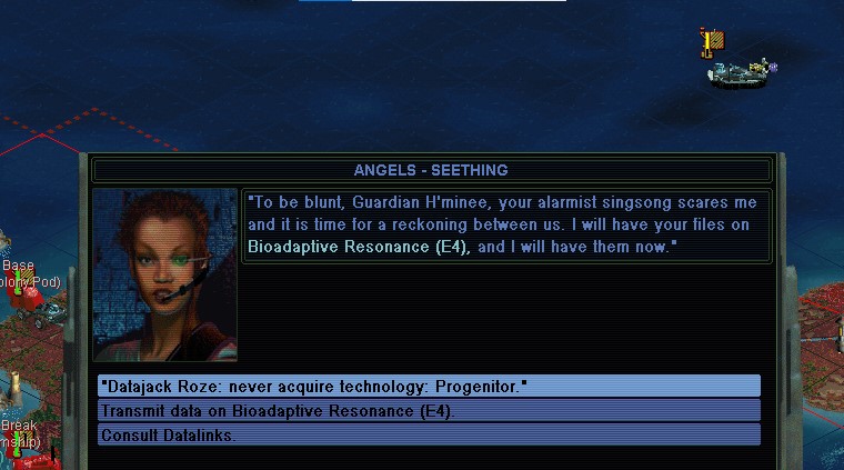 Roze tells me all about her new Gatling Needlejets, and thinks she's going to shake me down about it.  Given the distance between us, I'm hardly scared.  She could start doing air raids over the (previously) Free Drone island though.  I happened to have stationed my 1 Skimship Probe Team on its southern coast, just a stone's throw from a Datatech city.  She happened to fail to defend it, so I steal C4 Neural Grafting.  That's the end of my foil probe.