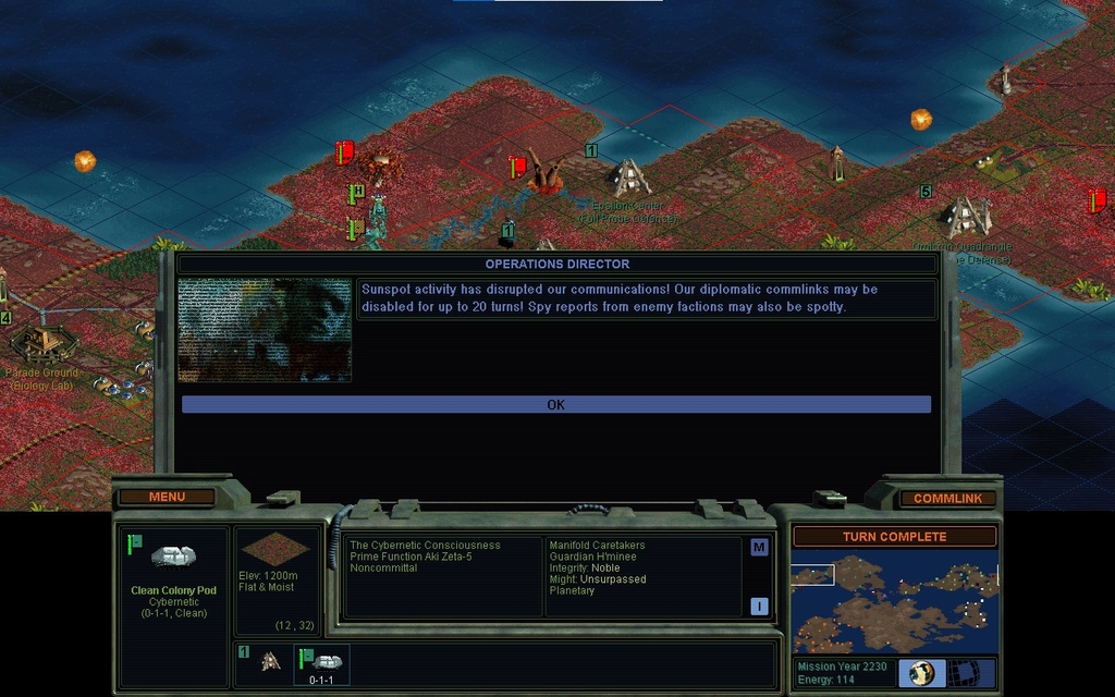 MY 2228.  Not sure why I didn't get a "2 turns to completion" warning about this, but it proves my point.  Since we're not in sunspots, it would seem to indicate that the Believers rushed it with cash.  I'm not sure if I've seen the AI do that before, or recently.  Rushing with a Supply Crawler is far more typical, and I don't think the AI uses Artifacts for the job at all.  This was to be my 2nd priority project.  I switch my copy to the Planetary Energy Grid instead.