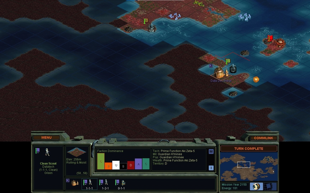 MY 2150.  I infiltrate the Data Angels.  I could steal from them, but I think I still won't be talking for awhile.  I have more Skimship Probe Teams in production.  This one dies though.  Surprisingly, the Data Angels have much less technology than I do.  They seem to have most of a supercontinent to themselves.  Wonder what their problem is?