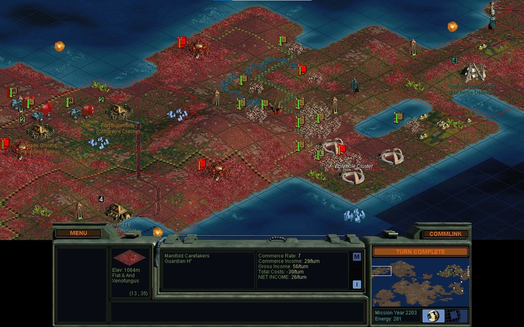 I was surprised to lose a Unity Rover to a Former.  It didn't have a Sensor Array backing it up, it was just sitting on some forest.  Clearing road obstructions slowed my offensive somewhat.  I could probably take 1 more city this year, but this is an excellent defensive line that nobody's getting past.  I bring in 2 fresh mindworms and 2 Scouts for use next year, so that I don't have to complete the rail line if I don't want to.