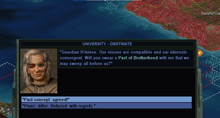 MY 2207.  I'm just trying to pass through, to go get some sea supply pods on the other side of his territory.  He wants war with the Believers and I'm not going to do that.  But hey, if he's dumb enough to sign a Pact anyway, that I'll never actually give him a shred of support for, well have at it!  Of course he insists on the war and I decline, so we don't sign anything.  I sail on through.