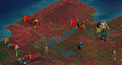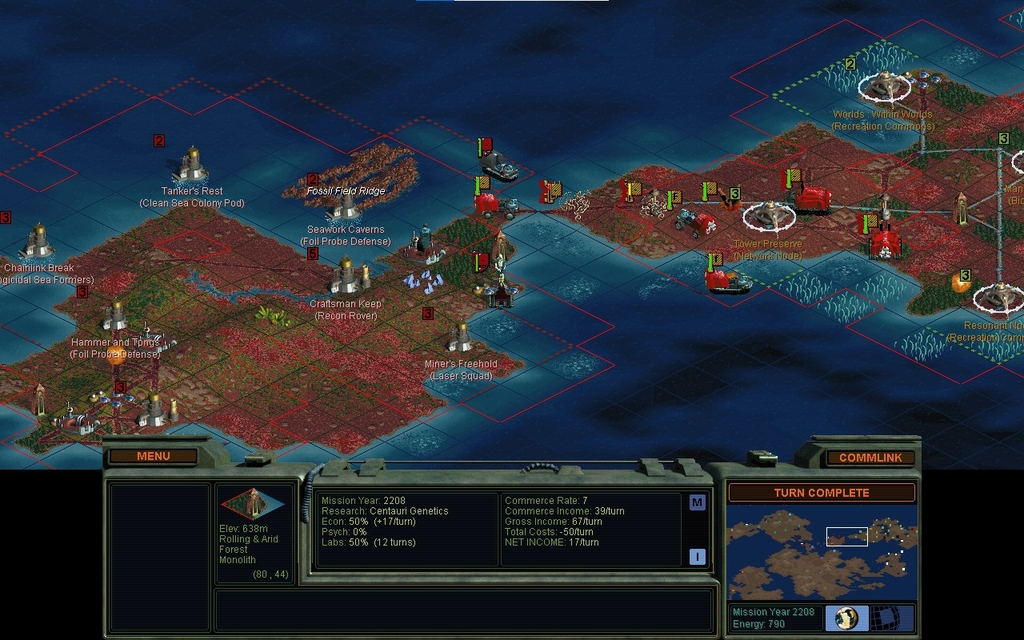 MY 2210.  My Plasma unit is slammed by 2 Recon Rovers, but it holds and is promoted to Elite.  The 2nd Rover was really feeble.  Must not have been trained at a Command Center.  I could upgrade the unit to an ECM 3-Pulse unit, but why bother? It's not like Domai's got anything that can deal with me, or that he's gonna be on this island very long.  I just stand still on the Monolith and heal up, as it's a good point of defense.  Wouldn't mind having that forest back now, but you can't plant stuff on a Monolith.  You just have to wait for it to spread on its own.  Formers come up and put a rail on the Monolith.  Turns out this connects it to some network Domai helpfully built for me.