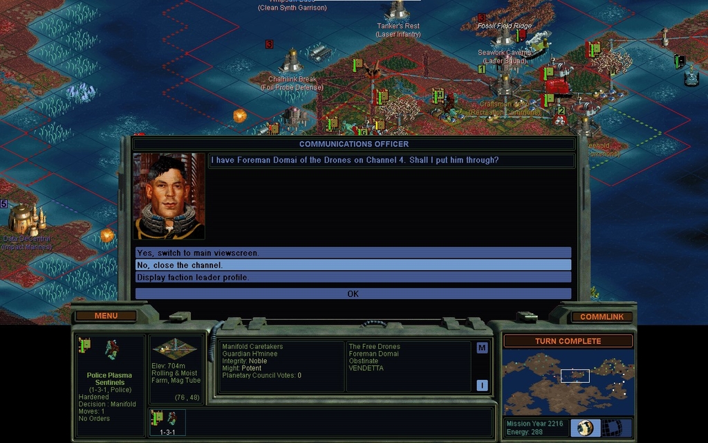 MY 2214.  I have not produced any kind of defensive probe units.  I'm only starting to do so now, as my home cities complete everything else that's 'basic' to a base.  This is not a problem on land because I'm inside of Domai's production timing.  He will not get any probe teams built before his last 2 cities are conquered.  The same is not true at sea though.  He's got a foil probe team just south of Chainlink Break.  In principle, if I take Hammer and Tongs this year, he could take it right back with mind control.  He's definitely got the money to do it.  It's only a question of whether the AI understands taking over a land base using a sea unit.  I think I've seen this happen before, but I'm not sure.  There's no question that the AI goes after sea bases with sea probe teams, in fact it has quite the obsessive passion about that.  This is a very good reason to leave someone's sea bases alone and not build any of one's own, until one has the Hunter-Seeker Algorithm or such.