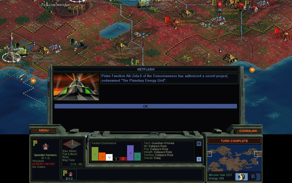 MY 2228.  Not sure why I didn't get a "2 turns to completion" warning about this, but it proves my point.  Since we're not in sunspots, it would seem to indicate that the Believers rushed it with cash.  I'm not sure if I've seen the AI do that before, or recently.  Rushing with a Supply Crawler is far more typical, and I don't think the AI uses Artifacts for the job at all.  This was to be my 2nd priority project.  I switch my copy to the Planetary Energy Grid instead.