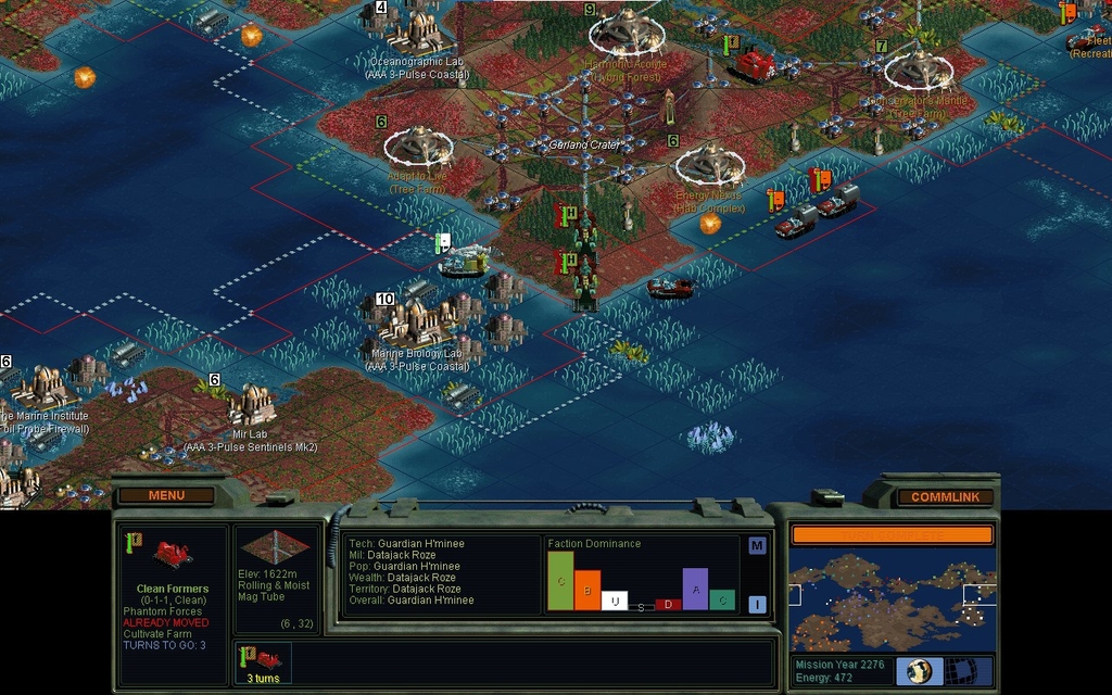 MY 2273.  I deploy my 1st Clean Hover Former.  It's much quieter this year, so I don't need to do any heroics with mindworms and fungi.  I carve a road into rocky terrain, in anticipation of building a Mine there.  I've done this sort of procedure on most Rocky terrain squares in my empire, but previously it would cost a unit a lost turn to do it.  Generally now I'm shifting to a mix of AAA garrison units and Hover Formers.  I have Gatling Interceptors heading towards Domai's territory to stop his sea bombardments and occasional Impact Rovers.  My population grows, and if I make enough Hover Formers, perhaps I can really interfere with everyone.  I don't think I basically need any new tech.