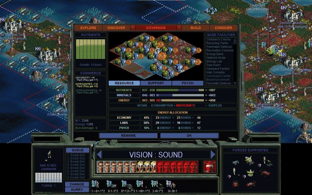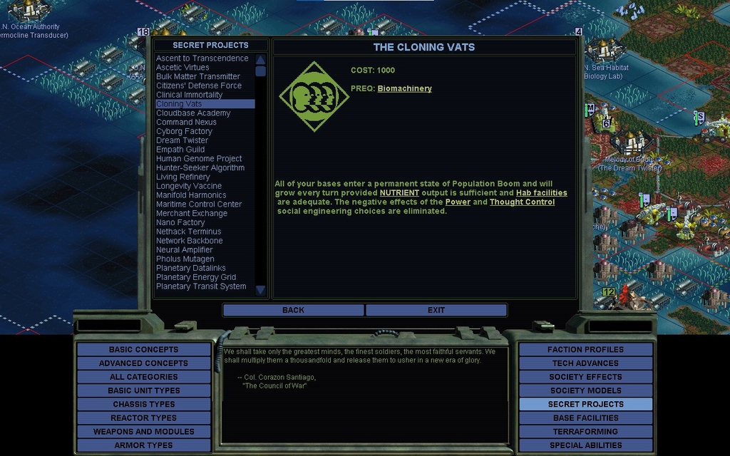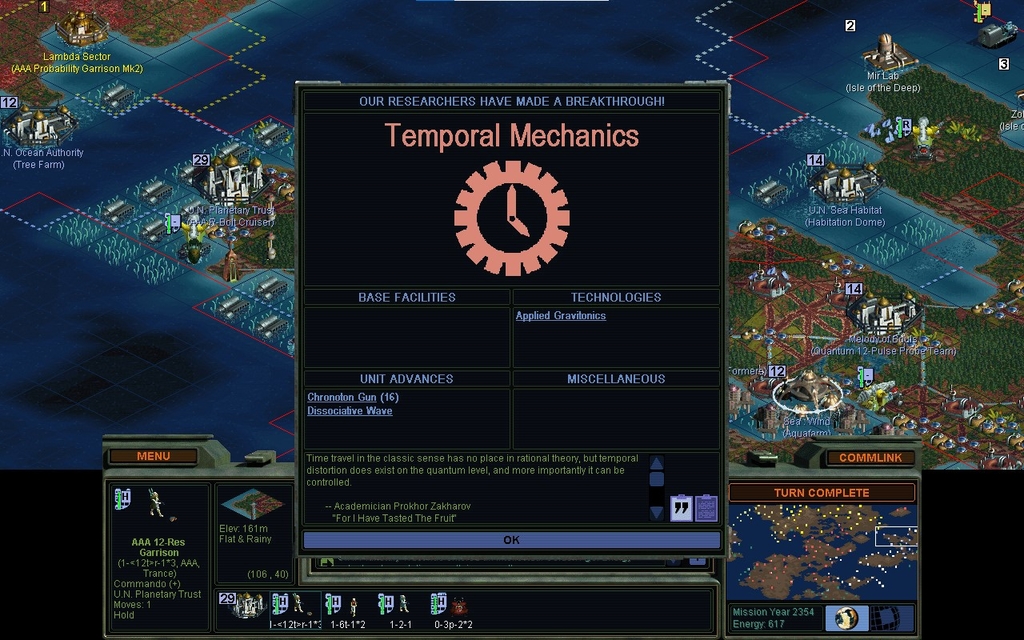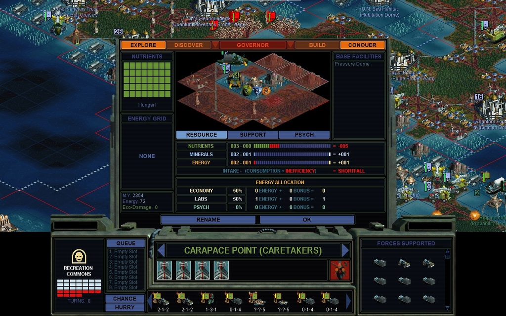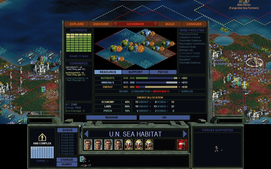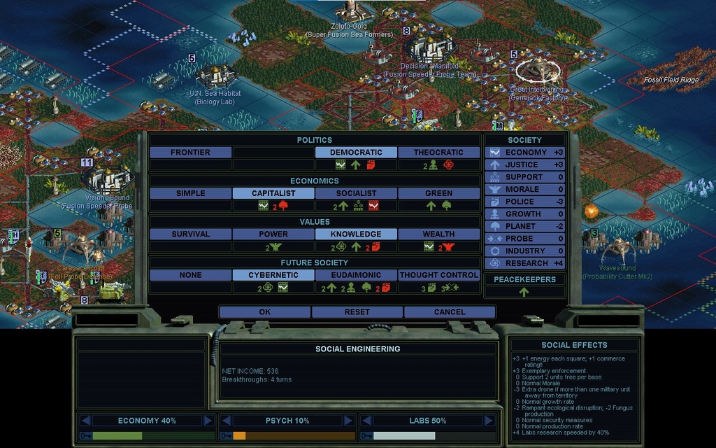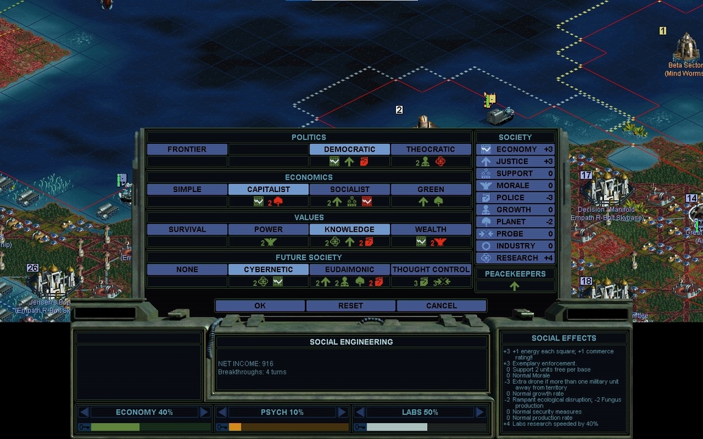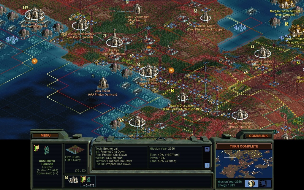 Truth is, Power and Thought Control don't actually do anything for me that I need.  If I actually wanted to make troops, nobody could touch me anyways.  I'm not at much risk of having my bases subverted, as my screen of 3-Pulse probe teams is well underway.  I'm not out on campaign so my POLICE rating doesn't matter, and I'm sure I could trash everyone with 1 unit per city anyways.  Not that I really have to stick to that, as pretty soon I'll have lotsa extra Empaths in various cities.  Plus I could also make Brood Pits.  That again was supposed to be a late game wonder facility that nobody would actually use, and I'm surprised I'm playing a game where I might consider doing it.  I could home all my nukes to 1 city that doesn't get unhappy about them, for instance.