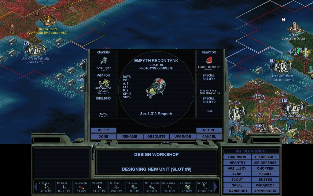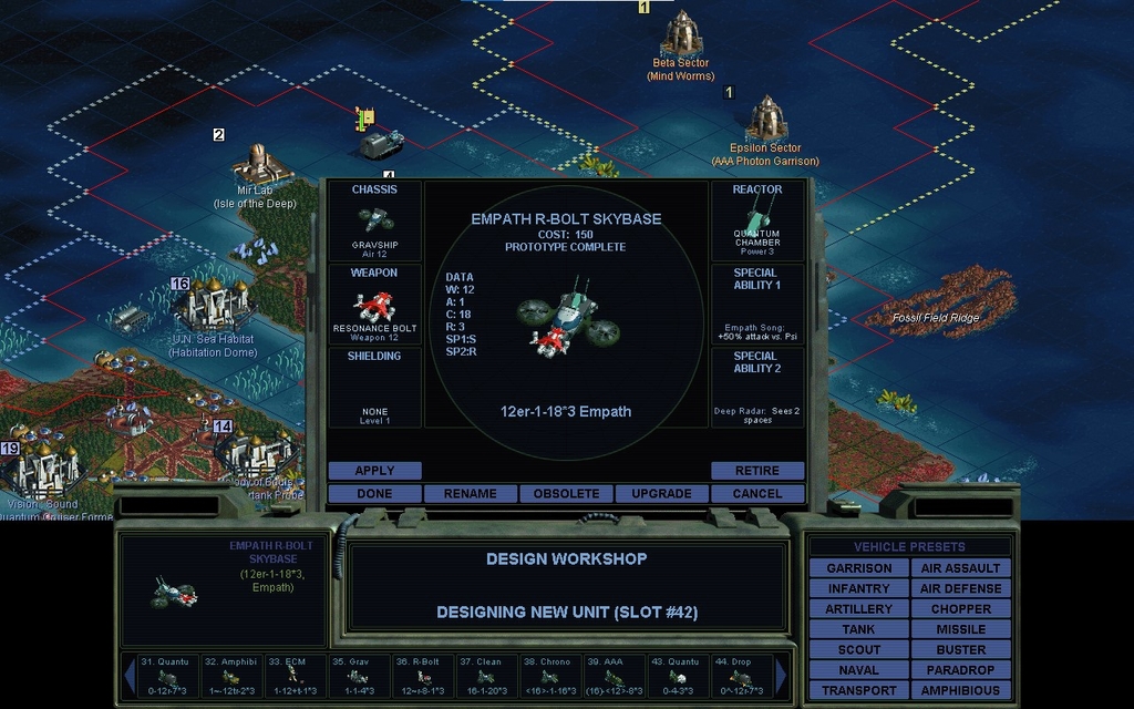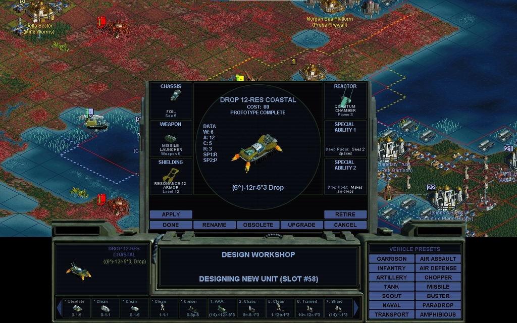 What I need is a ship that can zip over to the other side of my awkward land mass.  Drop pods are allowed on ships in my mod.  They can be really useful for moving infantry around.  I think larger reactors add additional movement to the unit, as I need to go 6 spaces, not 5.