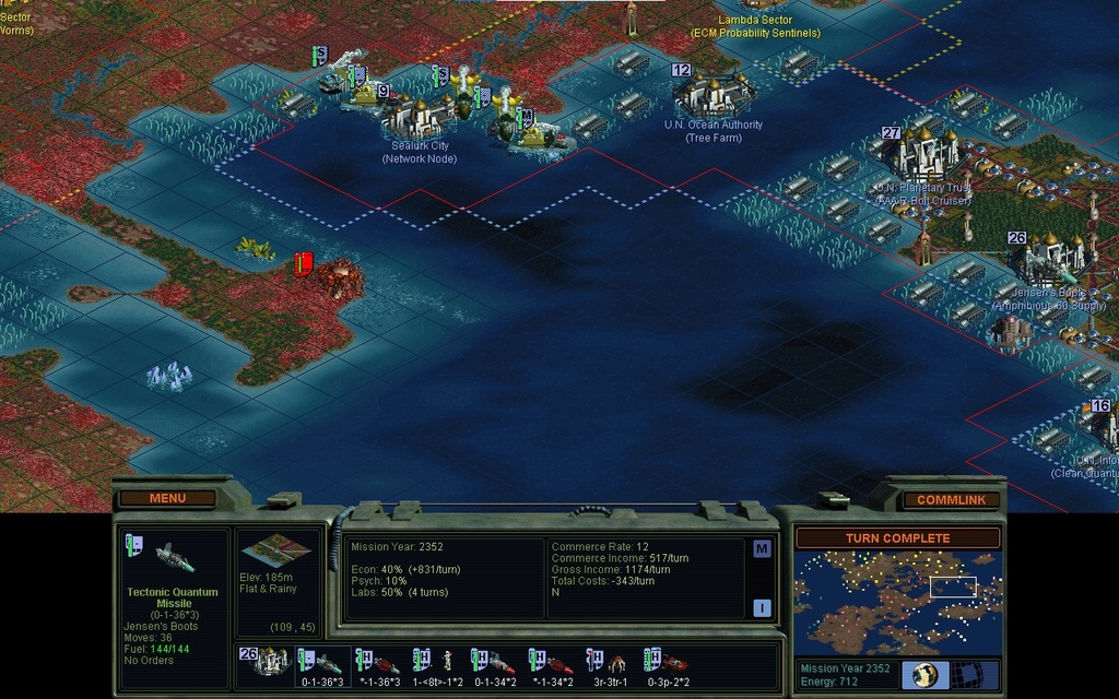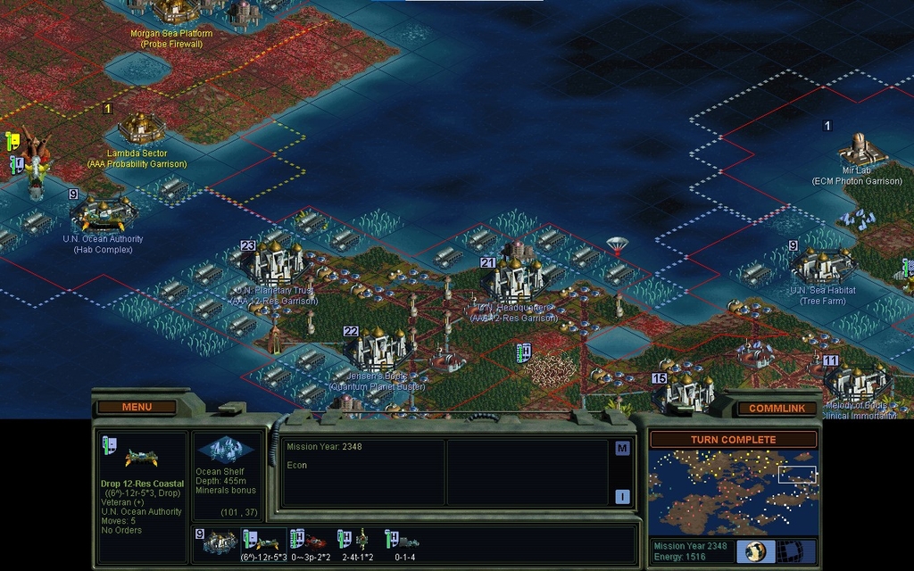 MY 2351.  Now I won't be worrying about how far away my drop ships are from anything.  Only whether they've got a coastal base to land at.  Actually they can land inland, they just can't go anywhere.  One game I felt like I was going through this "Scottish locks" system to get to the other side of things.