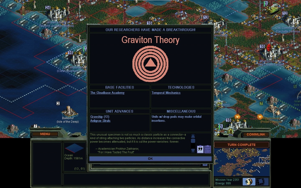 The other is usually at this point in the game, I've had the Space Elevator and been capable of orbital insertion.  I haven't learned Graviton Theory yet, so I'm only capable of limited cross land hops!  My ship is simply not in range to get to the other side of the land mass.  Note the parachute icon near U.N. Headquarters.  That's the limit of my range.  I can be "cute" and make it all the way to U.N. Sea Habitat in 1 turn, but that's it.