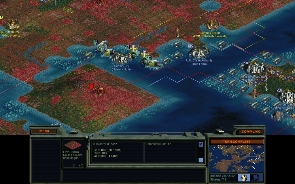 MY 2352.  Now what's the blast radius on these things?  If it's 3, then just northwest of that fungal tower would be an excellent spot to detonate.  It would turn a lot of that deep ocean around Sealurk City into coastal shelf.  Then I can rapidly terraform it.  Now if for some reason I'm wrong about the radius, I'm saving my game.