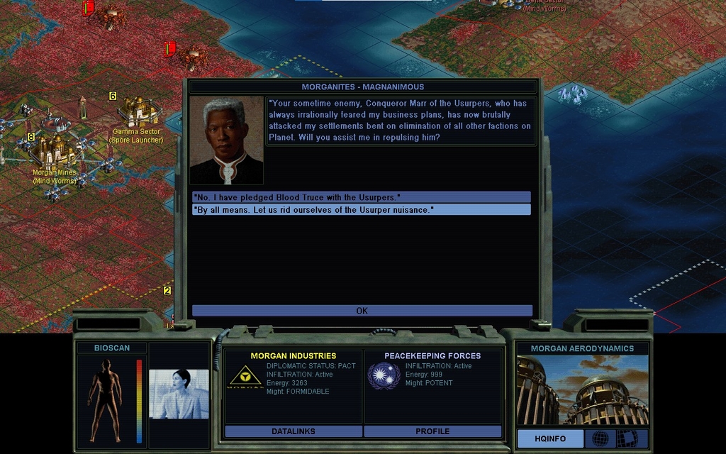 This particular conqueror believes strongly in Thought Control.  To bad he's not part of the U.N. fracas.  I could add him to the list of factions I mutually cannot please.  Well except by refusing any advanced society, but that's not gonna happen.  Hmm... but what if that got Cha Dawn to vote with me?  Nah.  Humans are too fractious, they'll never buy it.