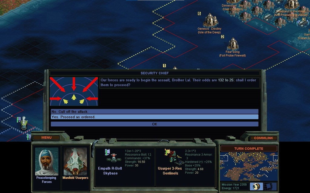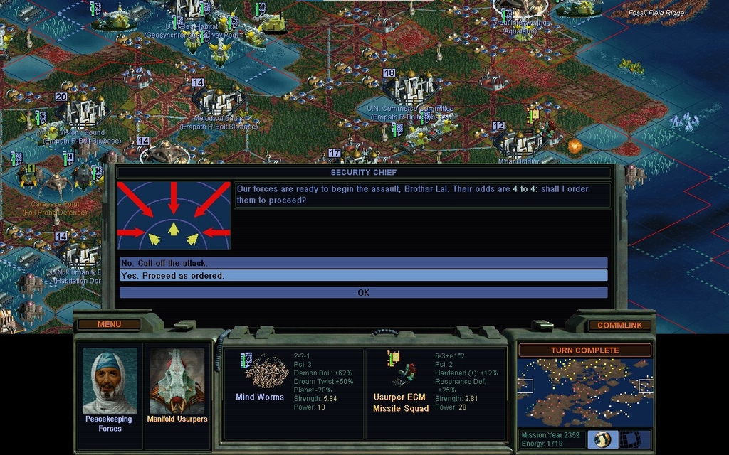 MY 2349.  I don't trust that Usurper creep sitting next to my city.  It's one of the few bases I haven't put some serious new armor in.  I've moved my mindworm from its holding fungal patch to the rail, in case the Usurper is a jerk.  I don't think it can penetrate Silksteel backed by a Sensor Array and a Perimeter Defense, but maybe it can.