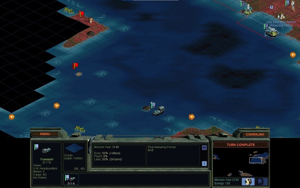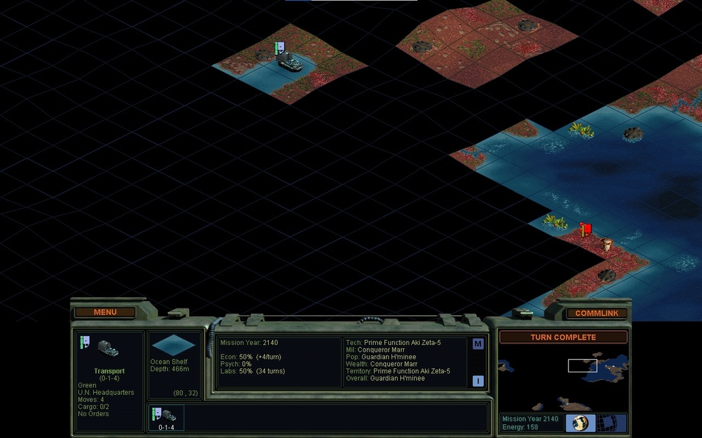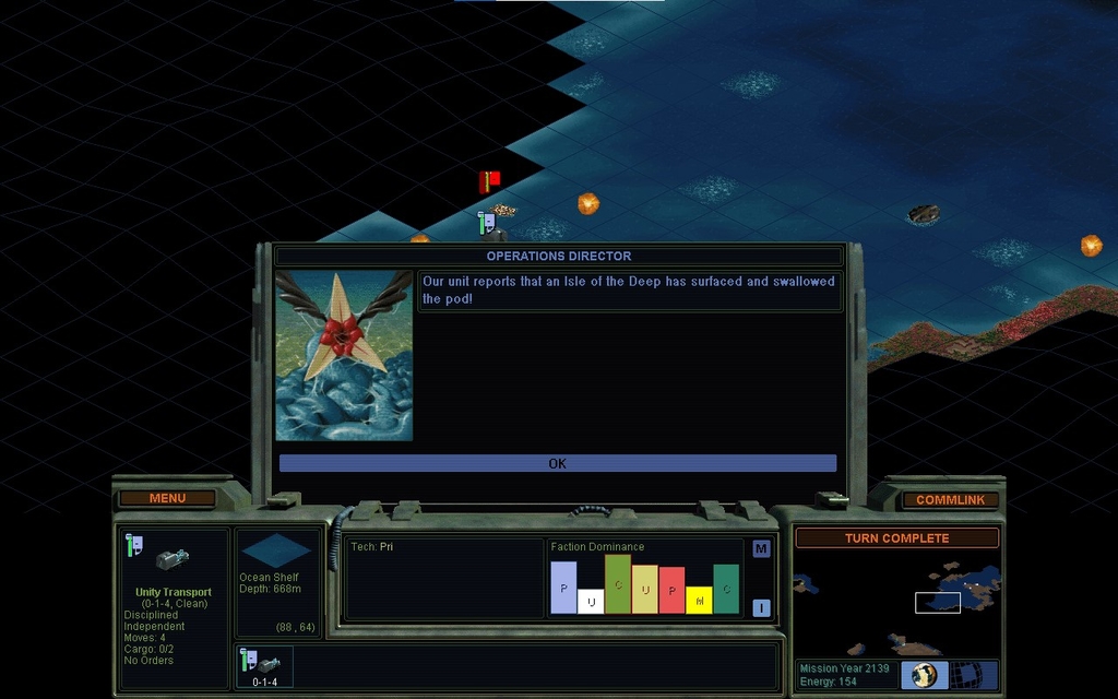 The Isle finally lands on our shore and spreads out some "mindworms", threatening our expensive former.  We attack quickly as before, destroying one of them without much hardship.  But it seems to strengthen the remaining one.  Using another scout as an escort, we remove our former from harm, then retreat to our base.  Perhaps we can provoke it into a poor assault.