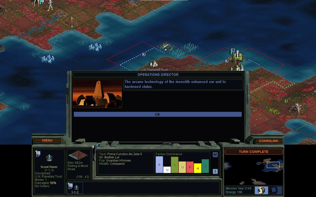 The same healing and improving effect the monolith had on the mindworm, it had upon us.  Our scout rover is now ready to deprive the Aliens of their minerals.