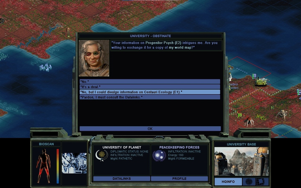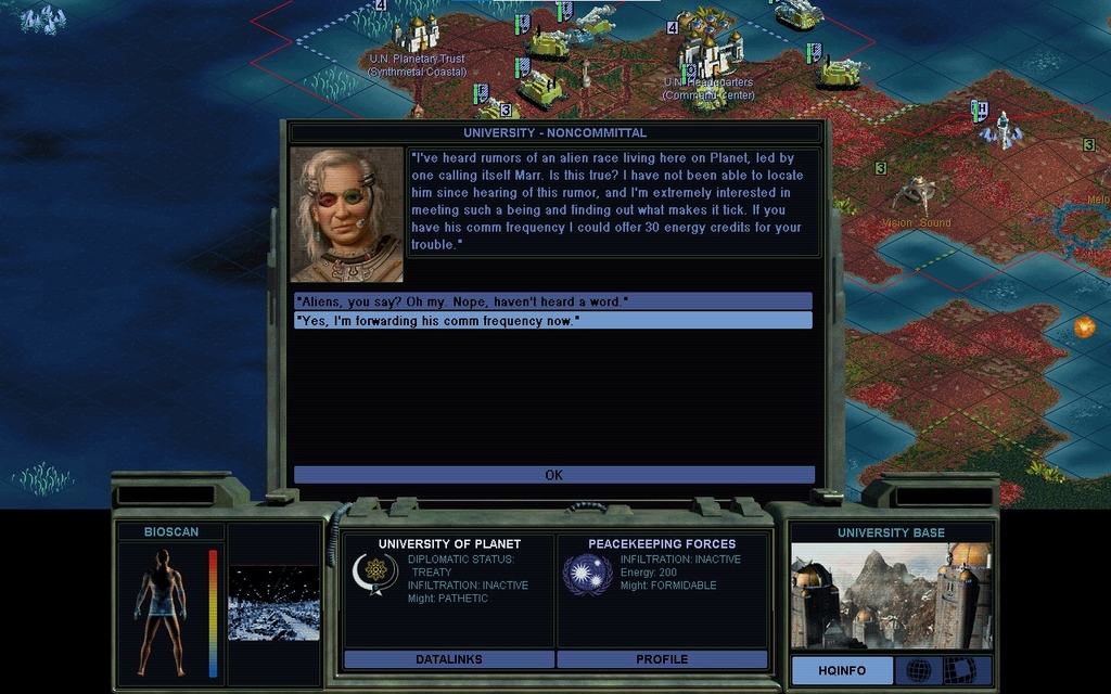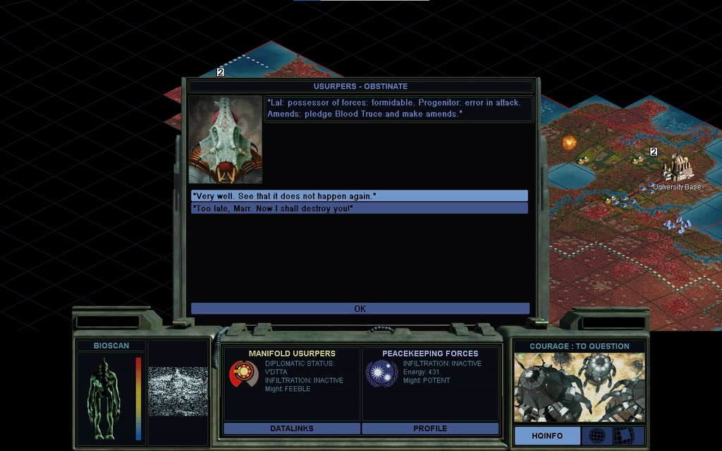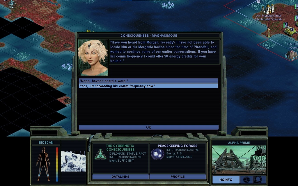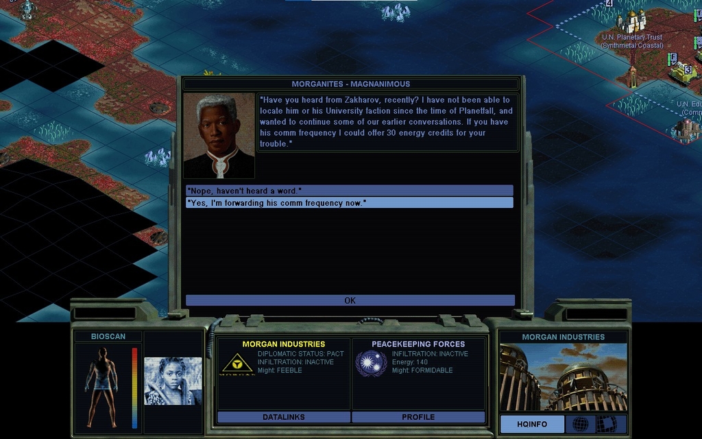 Mission year 21  .  The elusive Planet Cult has contacted my ally of convenience and declared war upon him.  I must press upon Zhakarov, that this is not at all convenient.  Planetary elections will shortly follow and I hardly need worry about his paltry number of votes, so he will do as I say.  I cut him off and contact this problem child.  Literally a child!  Walked out of a fungal patch somewhere.