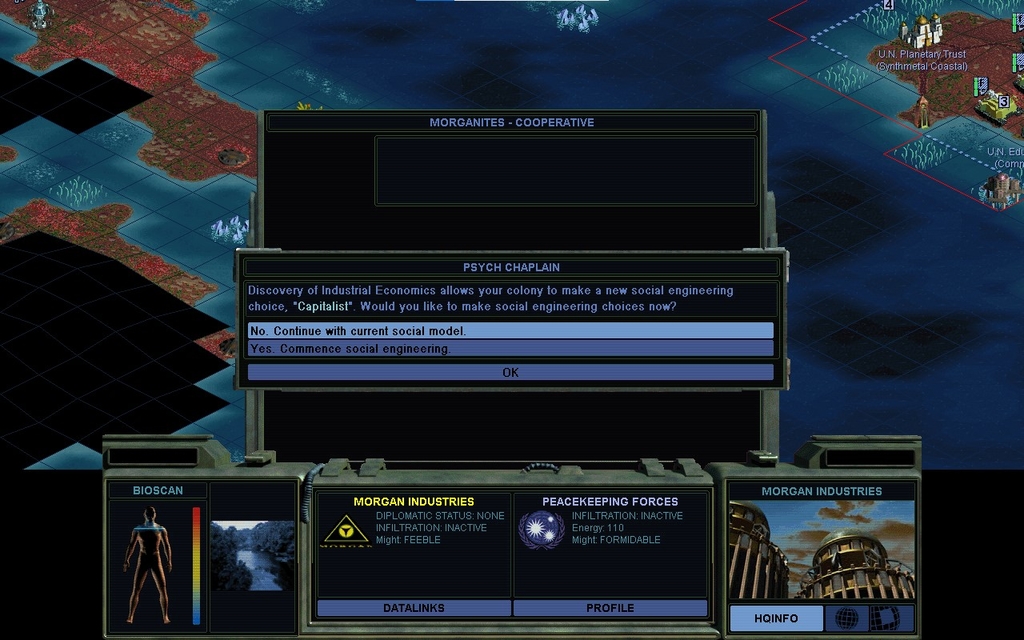 MY 2197.  I've been playtesting The Will To Power mod for so long, that I forgot my own version of Green doesn't have any downsides.  It doesn't do all that much, but, no downsides.  This is because of a bug in the original game where the Gaians won't choose Green until they know how to make Locusts of Chiron.  That can be almost late game and it's ridiculous for the Gaians not to go Green.  The only way to induce them to do it, is to make sure there are now downsides for Green.  People playing my mod for the 1st time who don't read the fine print of my design notes, i.e most people lol, may think this looks funny and wonder why my Social Engineering Table is laid out this way.  But it's for a reason, to work around bugs in the original game.  Some of the other table values are about preventing the AI from obsessing about things it shouldn't.