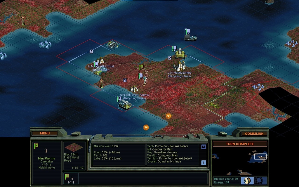 The Isle finally lands on our shore and spreads out some "mindworms", threatening our expensive former.  We attack quickly as before, destroying one of them without much hardship.  But it seems to strengthen the remaining one.  Using another scout as an escort, we remove our former from harm, then retreat to our base.  Perhaps we can provoke it into a poor assault.
