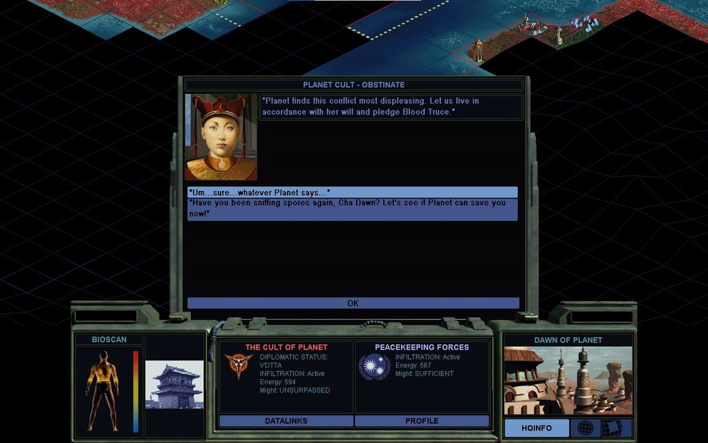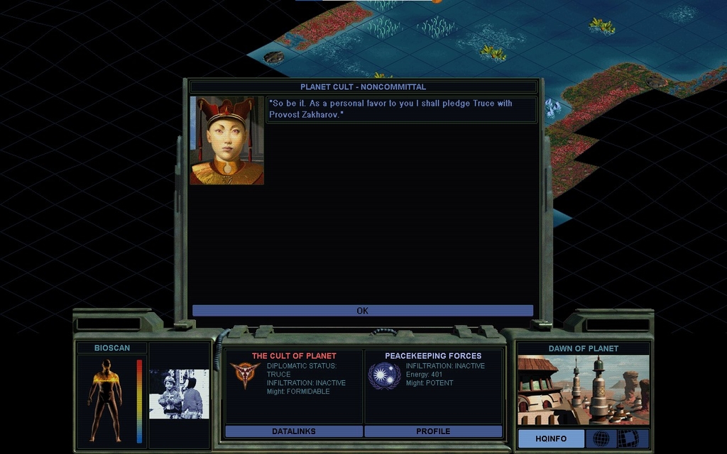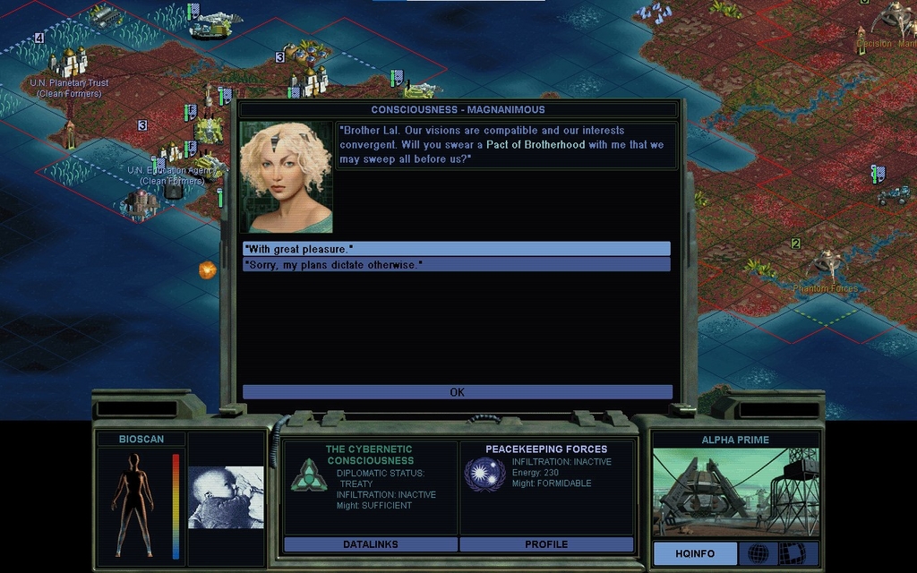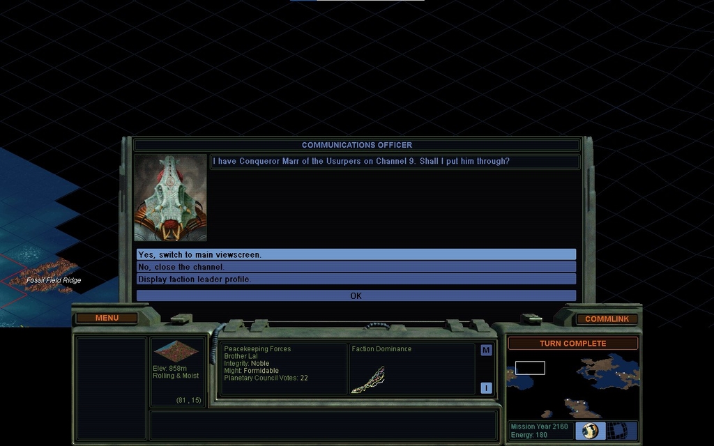Mission year 21  .  The elusive Planet Cult has contacted my ally of convenience and declared war upon him.  I must press upon Zhakarov, that this is not at all convenient.  Planetary elections will shortly follow and I hardly need worry about his paltry number of votes, so he will do as I say.  I cut him off and contact this problem child.  Literally a child!  Walked out of a fungal patch somewhere.